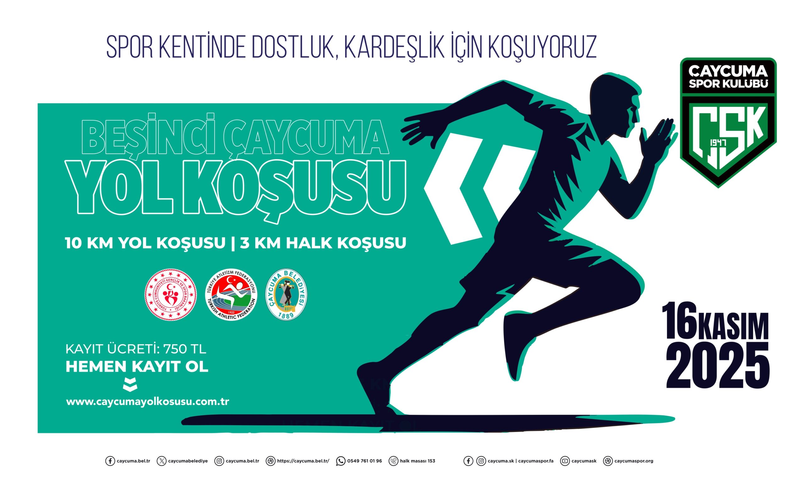 Çaycumaspor ve Çaycuma Belediyesi’nin birlikte düzenlediği 5. Çaycuma Yol Koşusu kayıtları başladı. İnternetteki https://caycumayolkosusu.com.tr/tr adresi üzerinden kayıt olunabilen koşu, 16 Kasım 2025 Pazar günü yapılacak. Saat 10.00’da başlayacak koşunun ödül töreniyse 12.00’de başlayacak.