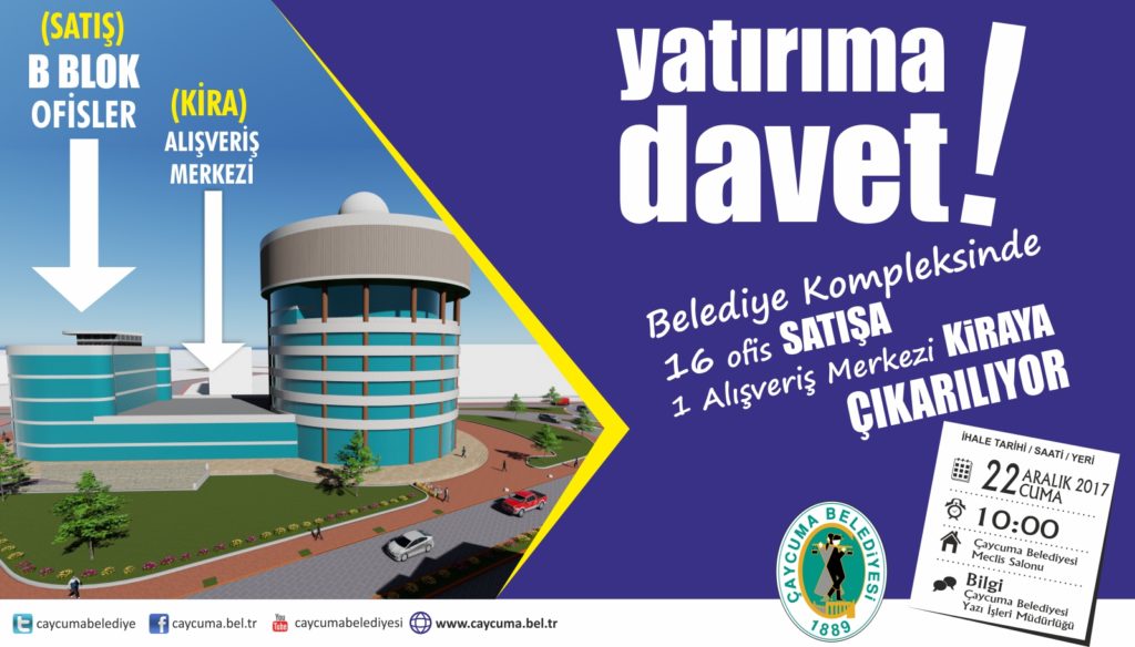 Sizi yakın gelecekte Çaycuma'nın kalbi olacak Belediye Kompleksinde iş yeri sahibi olmaya davet ediyoruz! İHALE İLANINI GÖRMEK İÇİN ...