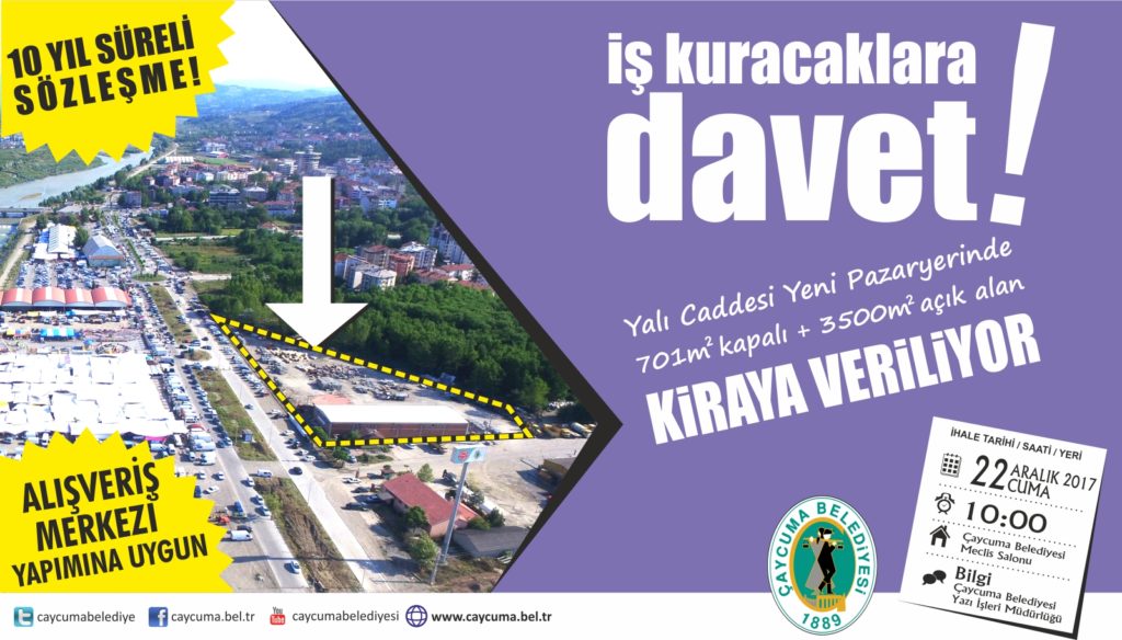 Pazaryerinin hemen kenarında tüm Çaycuma halkına hizmet edecek, her türlü tesis kurmaya uygun kapalı ve açık alan kiraya verilecektir. ...