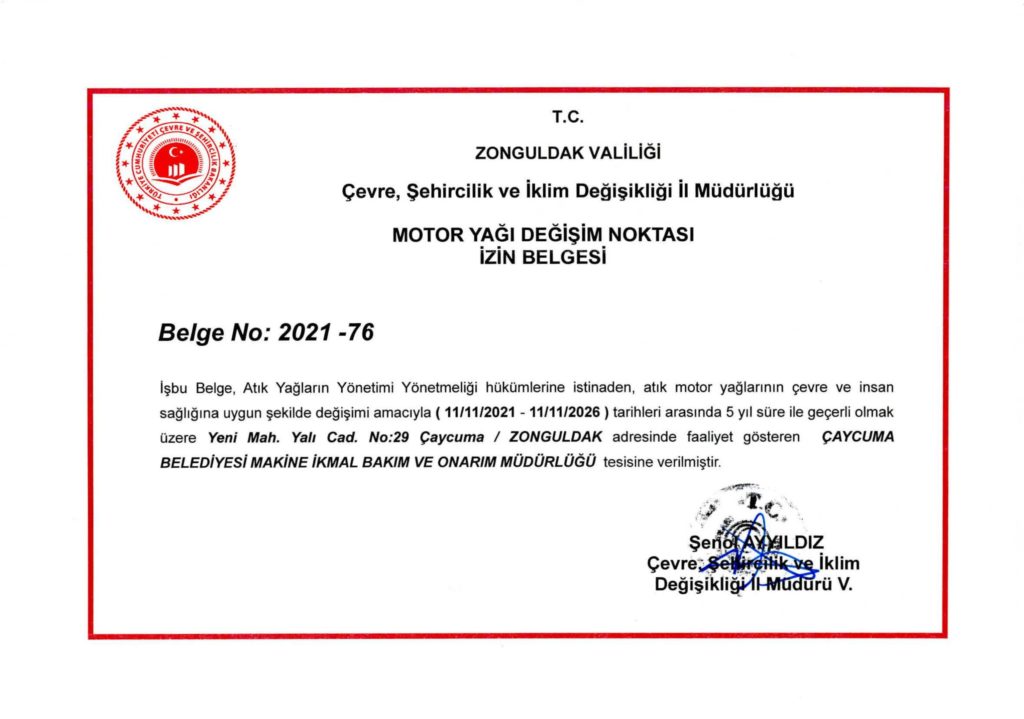Çaycuma Belediyesi Atık Yağların Yönetimi Yönetmeliği hükümleri uyarınca, Motor Yağı Değişim Noktası İzin Belgesi de alarak s...