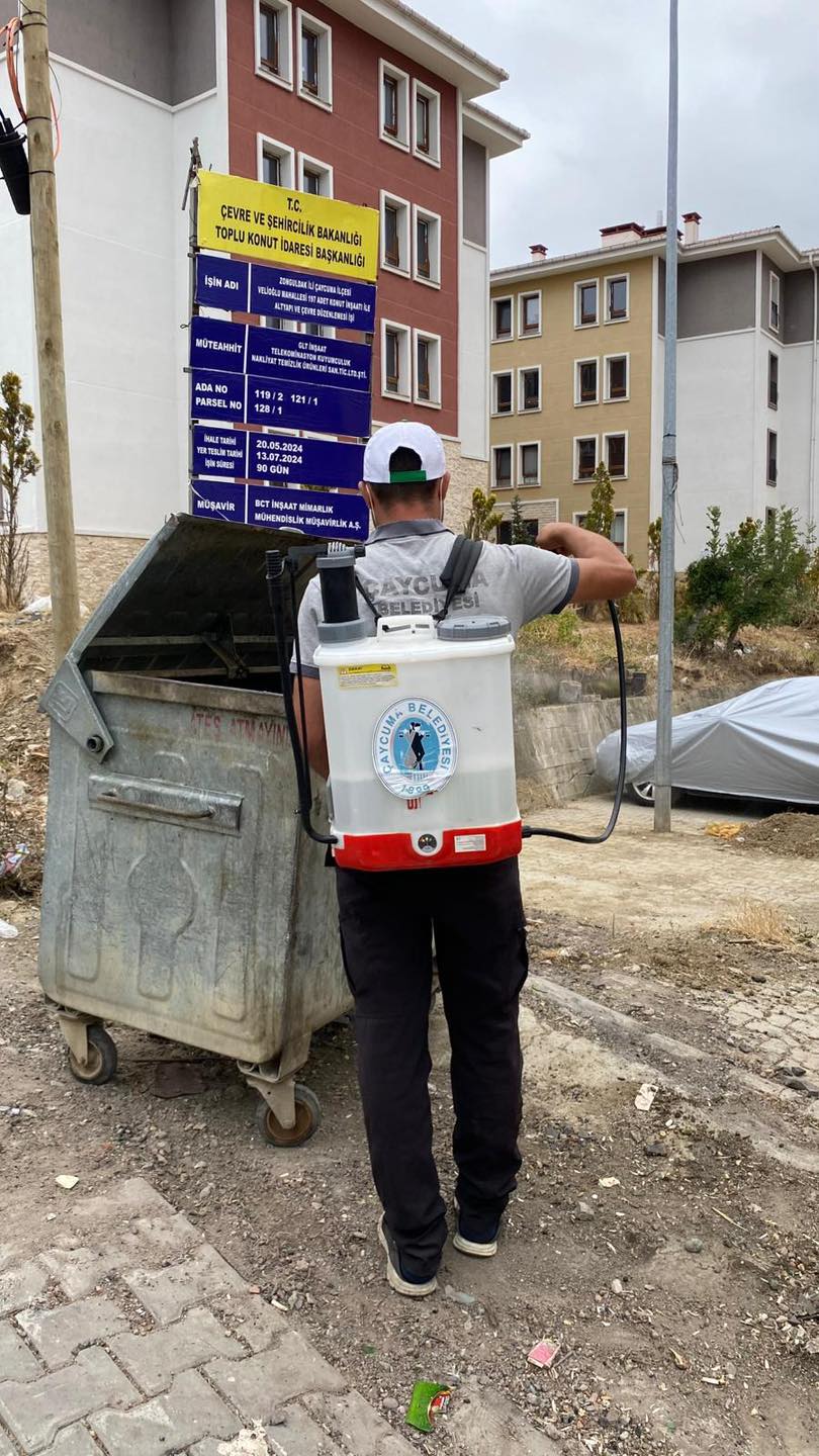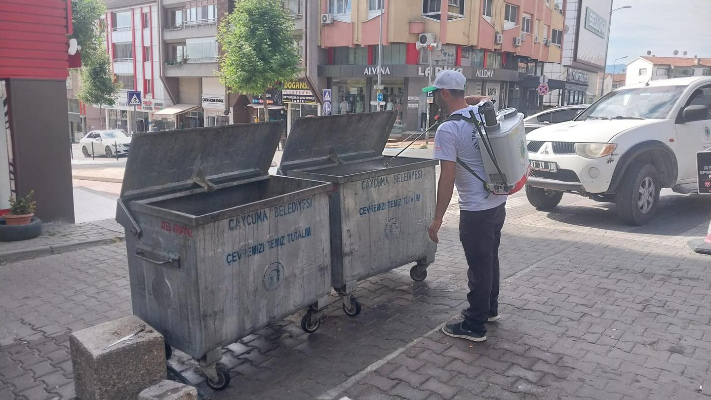 Çaycuma Belediyesi Temizlik İşleri Müdürlüğü, çöp konteynerlerini periyodik olarak ilaçlamaktadır. Çaycumalıların daha nitelikli ortamlarda yaşamasını sağlamak amacıyla yapılan bu çalışmada; sineklenmeyi önleyici, koku giderici, larva kesici, yağ sökücü kimyasalların yanı sıra dezenfektan olarak çamaşır suyunun da eklendiği bir karışım kullanılıyor.