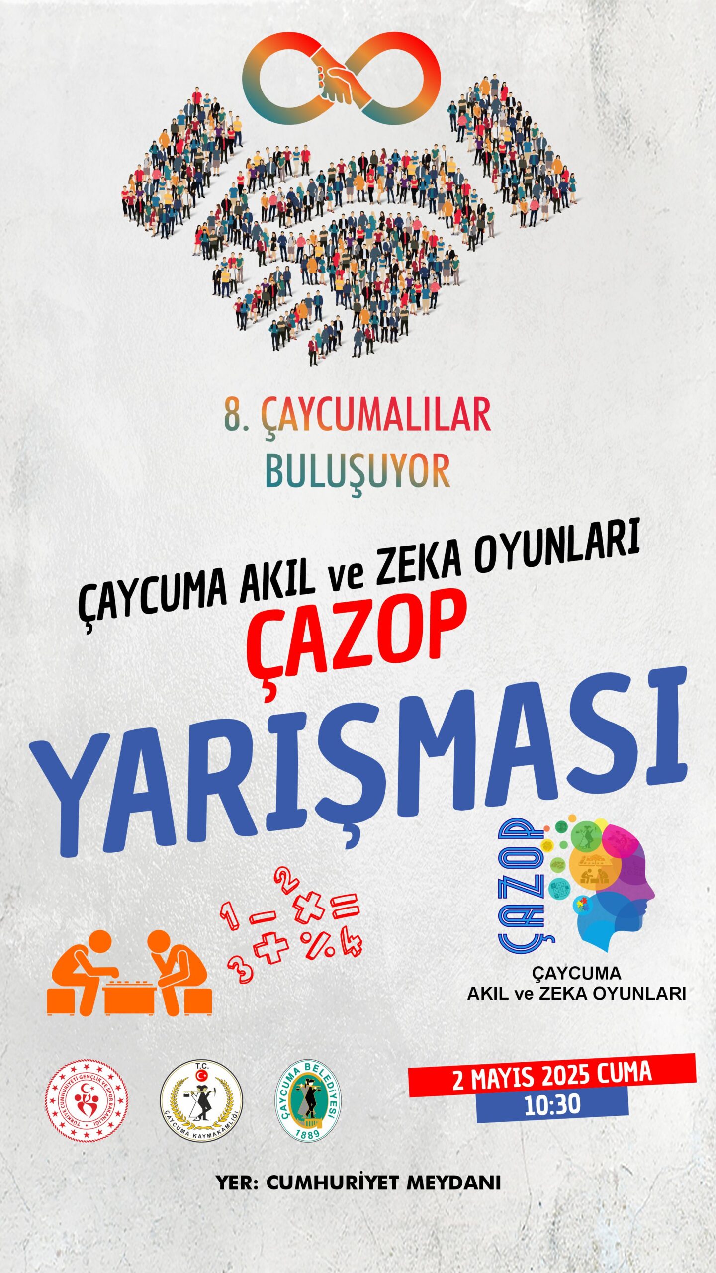 Çaycuma Belediyesinin Çaycuma Kaymakamlığı ile birlikte düzenlediği ve kentteki tüm sivil toplum örgütleriyle siyasi partilerin destek verdiği 8. Çaycumalılar Buluşuyor etkinlikleri, 2 Mayıs günü, saat 10.30 Akıl ve Zeka Oyunları Şenliği ile başlıyor. Cumhuriyet Meydanında yapılacak etkinlikte, çocuklarımız, stratejik düşünme becerilerini geliştiren çeşitli zeka oyunlarında gösteriler yapacak.