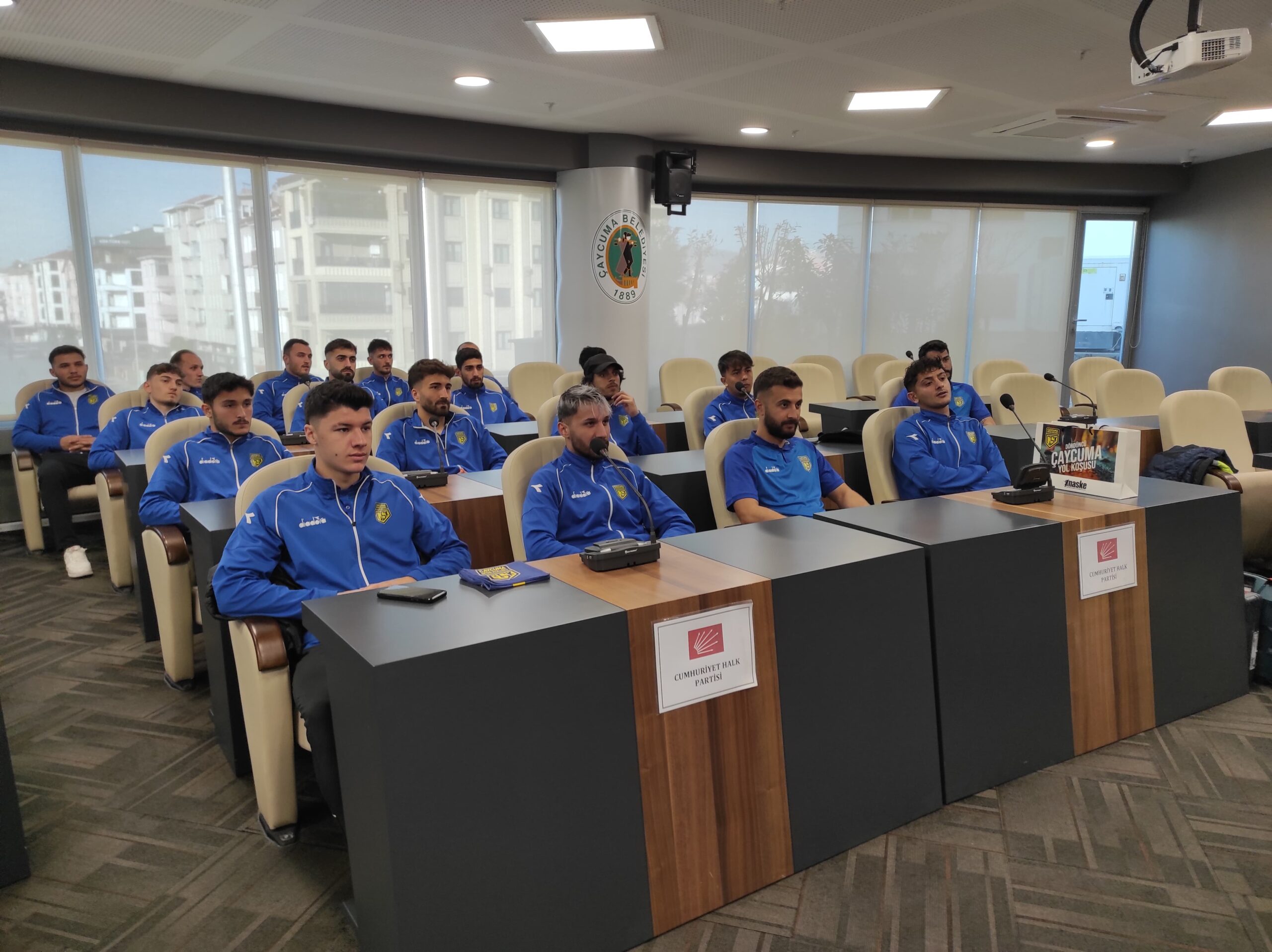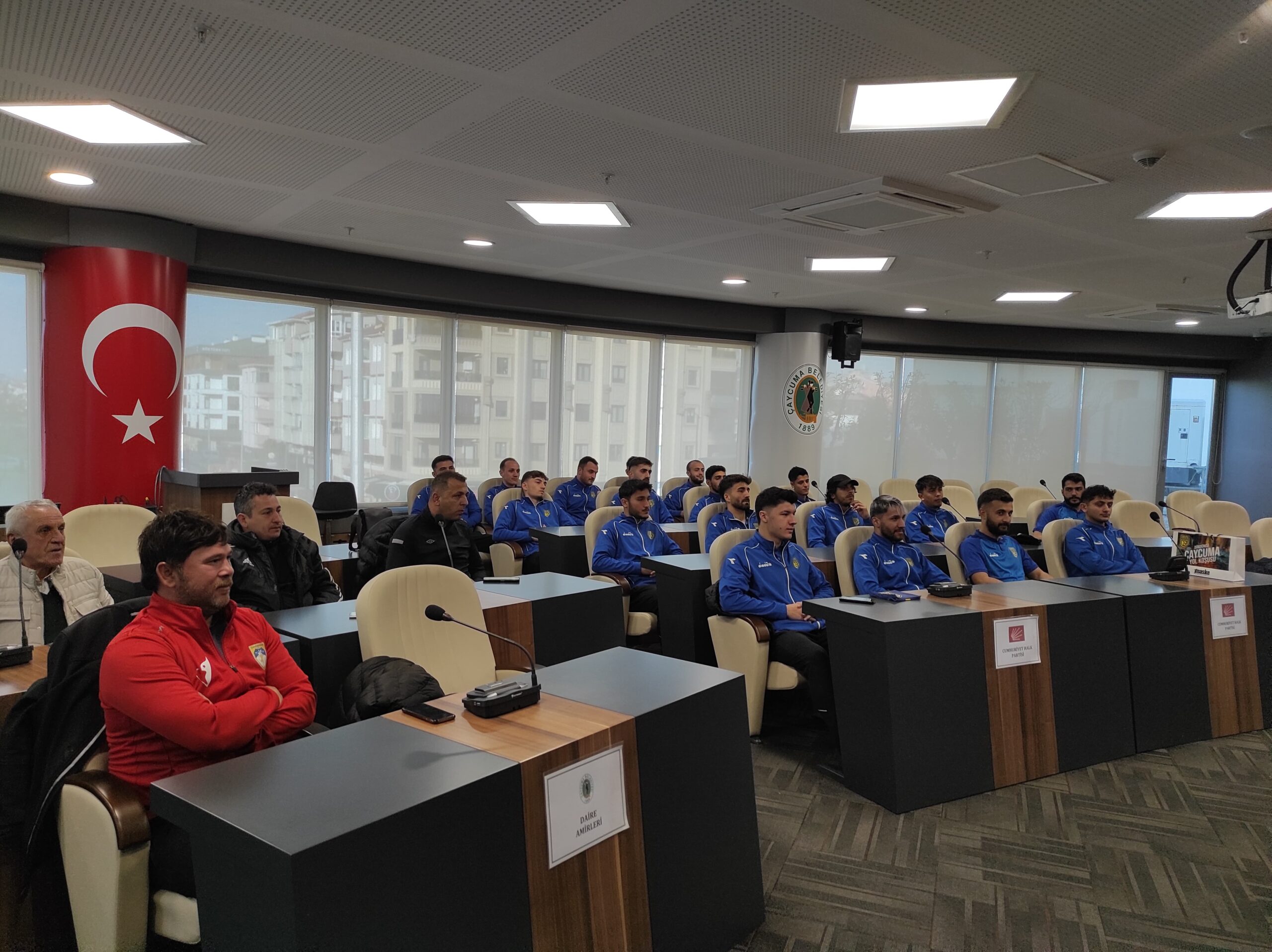 Zonguldak Süper Amatör Lig’den Bölgesel Amatör Lig’e (BAL) yükselme mücadelesi veren Çaycumaspor futbolcuları, Antrenörleri Suat Kerçin ile birlikte Çaycuma Belediye Başkanı Bülent Kantarcı’yı ziyaret etti. Konuklarını Belediye Meclis Salonu’nda ağırlayan Başkan Kantarcı, ligde, fair play kuralları çerçevesinde mücadele ettikleri için kendilerine teşekkür etti. Tüm sporcularla tek tek ilgilenip kişisel durumları hakkında bilgi alan Kantarcı, 21 sporcunun 17’sinin üniversitede okuyor olmasından büyük mutluluk duyduğunu da ifade etti.