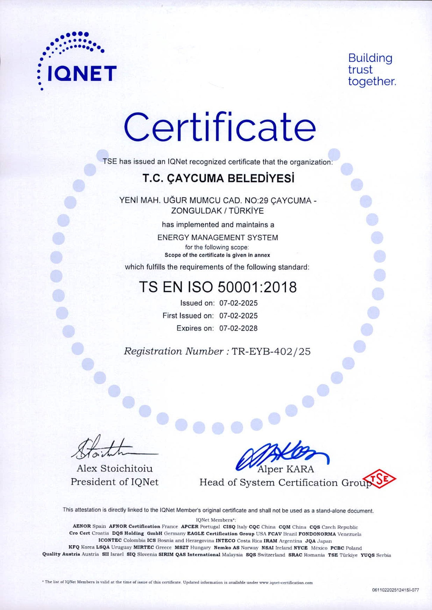 Şubat ayının ilk günlerinde, TSE baş denetçileri İbrahim Tecer ve Kemal Gök belgelendirme tetkiki yaptı. Yapılan tetkik sonunda majör ya da minör bir eksiklik tespiti edilmeyince, standardın gereklerini yerine getiren Çaycuma Belediyesine, TS EN ISO 50001 Enerji Yönetim Sistemi ve IQNET sertifikası almayı hak kazandı.