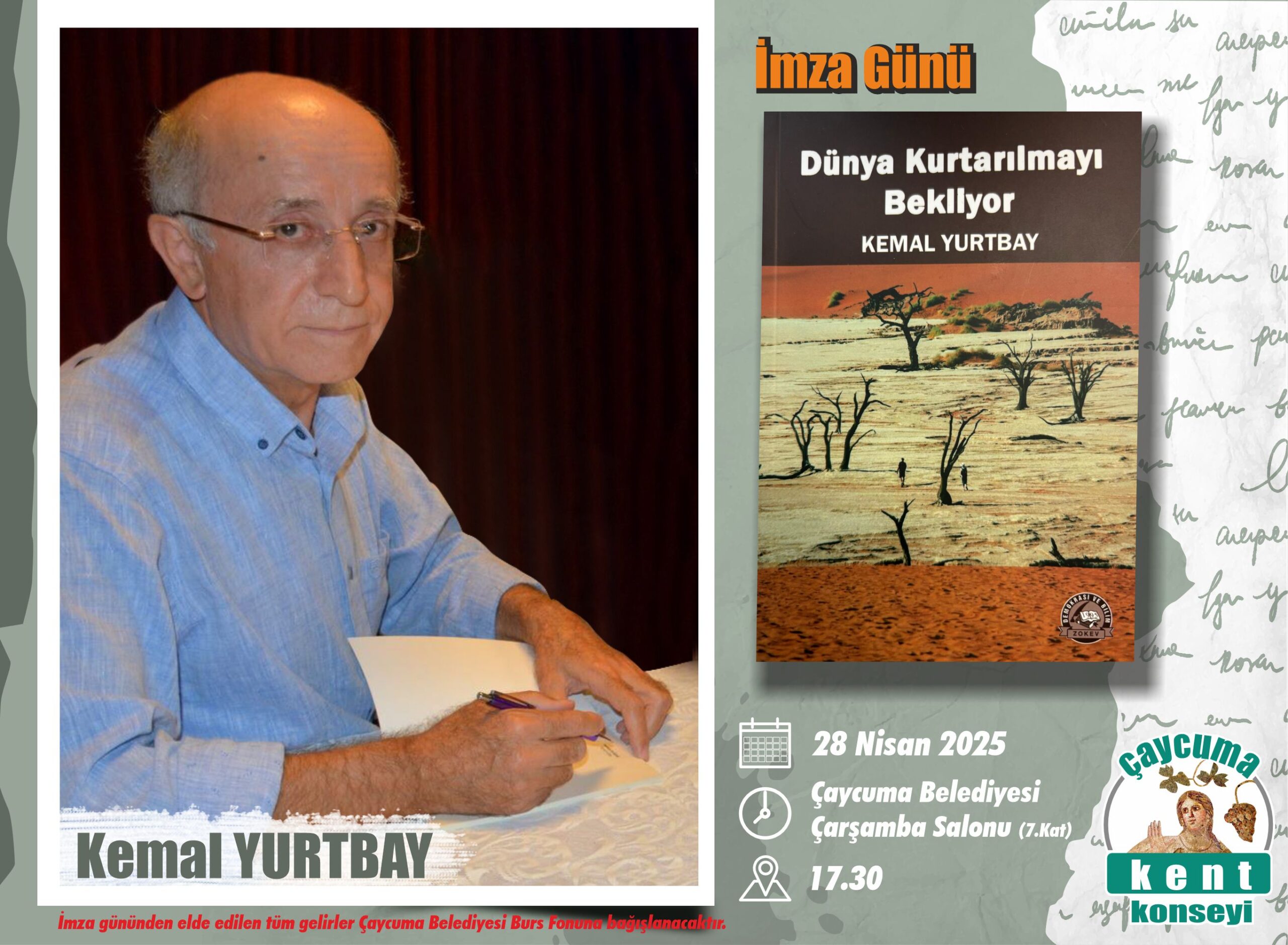 Zonguldak’ta uzun yıllar kulak burun boğaz hastalıkları uzmanı olarak çalışan emekli Doktor Kemal Yurtbay, Çaycuma Kent Konseyinin düzenlediği etkinlikte, son çıkan “Dünya Kurtarılmayı Bekliyor” adlı kitabını imzalayacak. Yurtbay’ın okurlarıyla kitap üzerine bir söyleşi de yapacağı da etkinlik, 28 Nisan Pazartesi günü, Belediyemiz Çarşamba Salonu’nda yapılacak. Saat 17.30’da başlayacak imza gününün tüm geliri Çaycuma Belediyesi Burs Fonuna bağışlanacak.