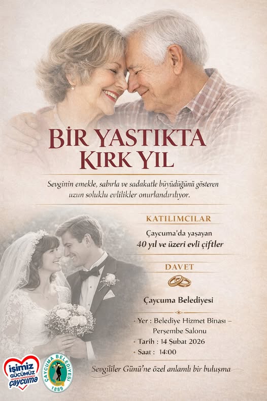 Çaycuma Belediyesi “14 Şubat Sevgililer Günü” nedeniyle farklı bir sosyal projeyi hayata geçiriyor. Zamana meydan okuyup sevgi, sabır ve emekle evliliklerini 40 yıl ve üstü zamandır sürdüren çiftleri “Bir Yastıkta Kırk Yıl” adlı buluşmada bir araya getiriyor. 17 Şubat Salı günü Çaycuma Belediyesi Perşembe Salonu’nda yapılacak etkinlikte anılar paylaşılacak, çiftlerin evlilik fotoğraflarından oluşan slayt gösterisi yapılıp günün anısına armağanlar sunulacak.